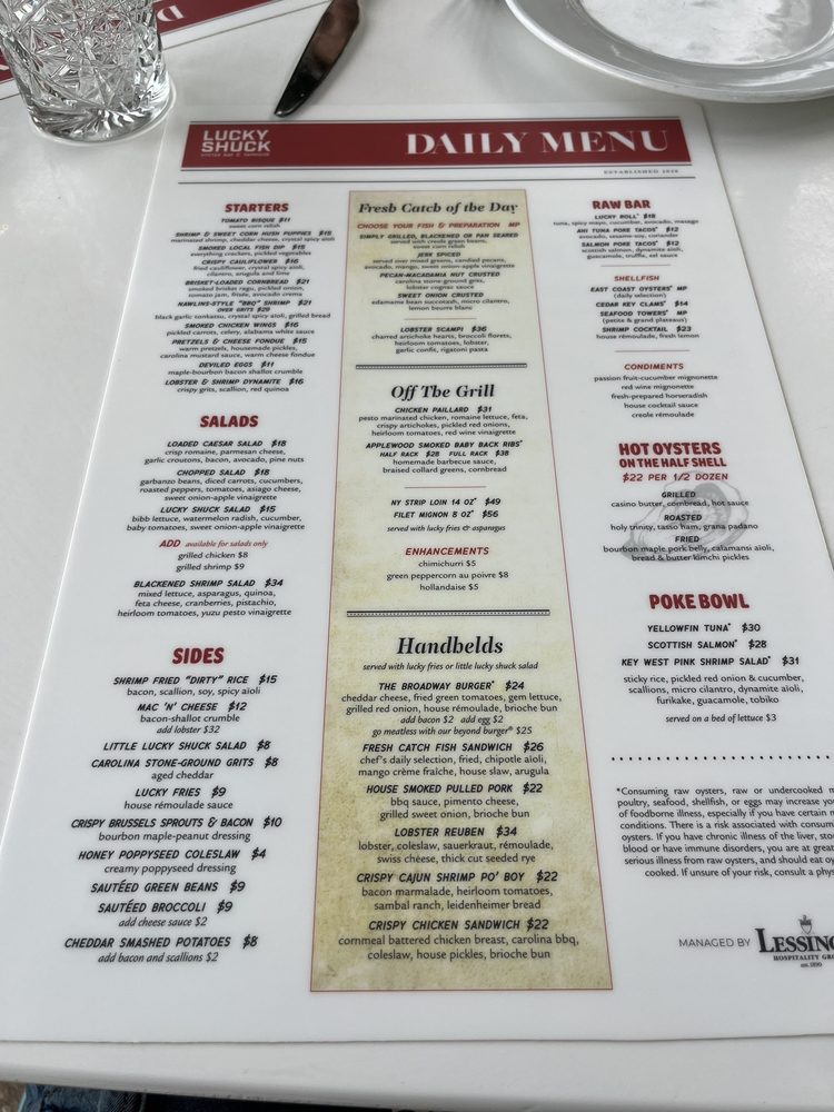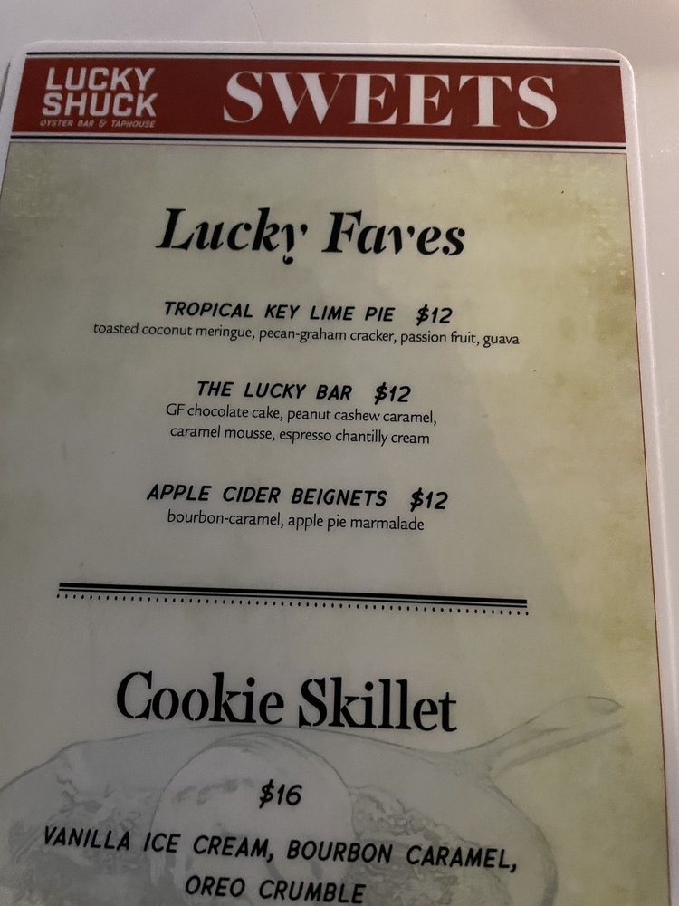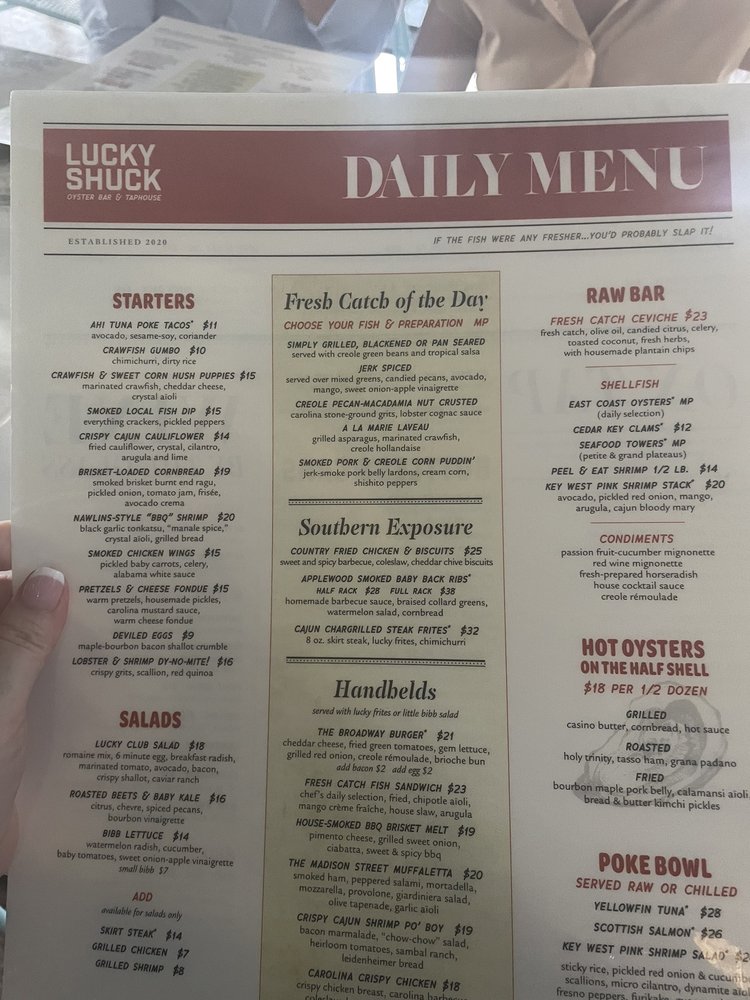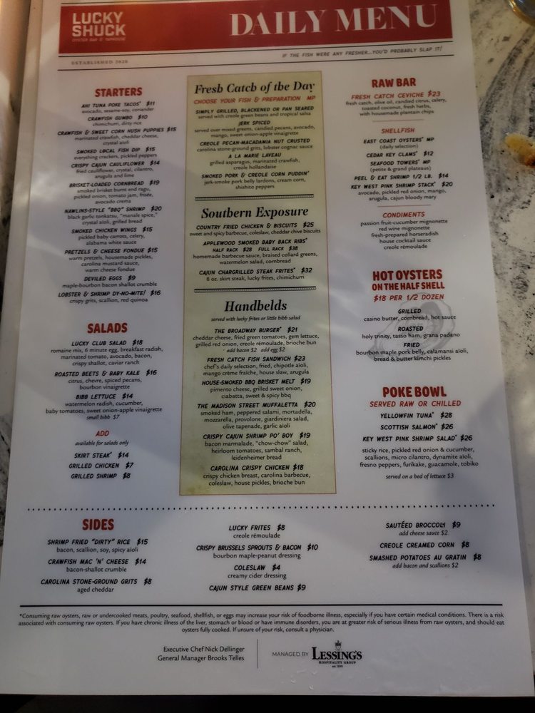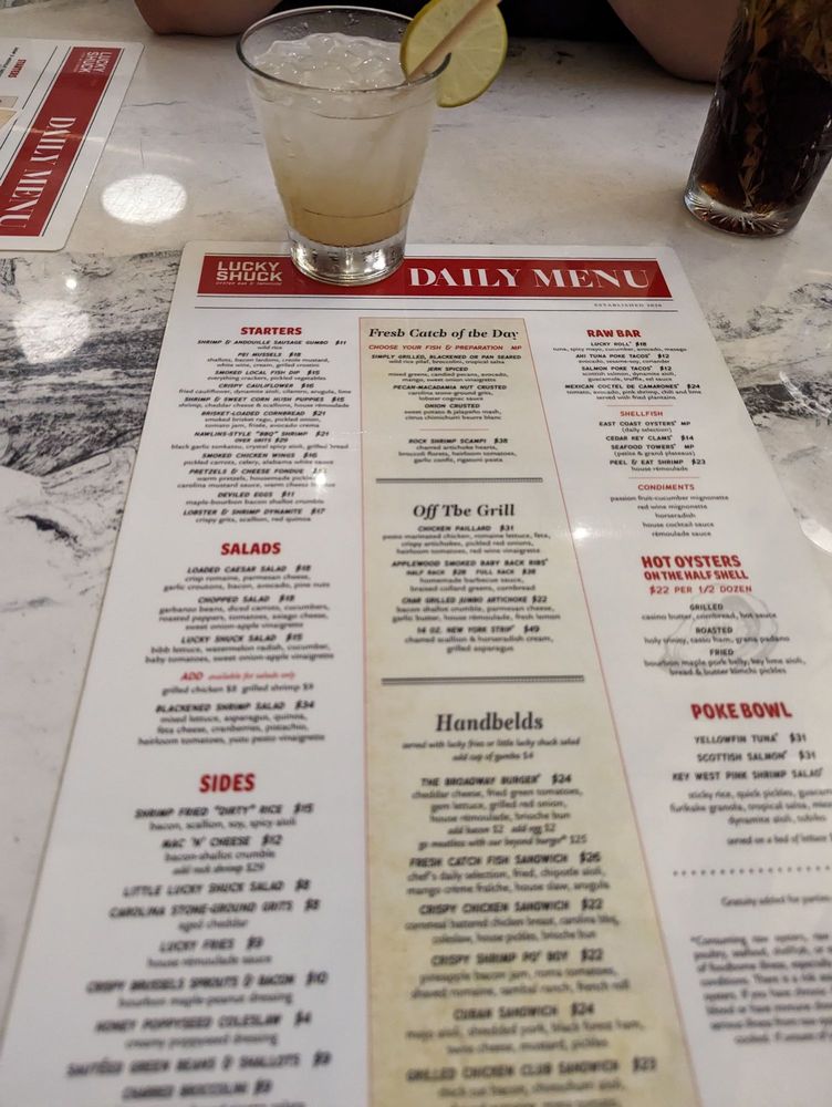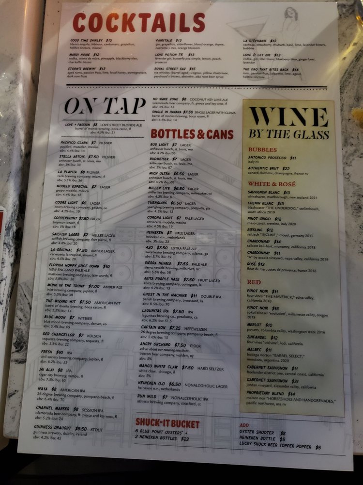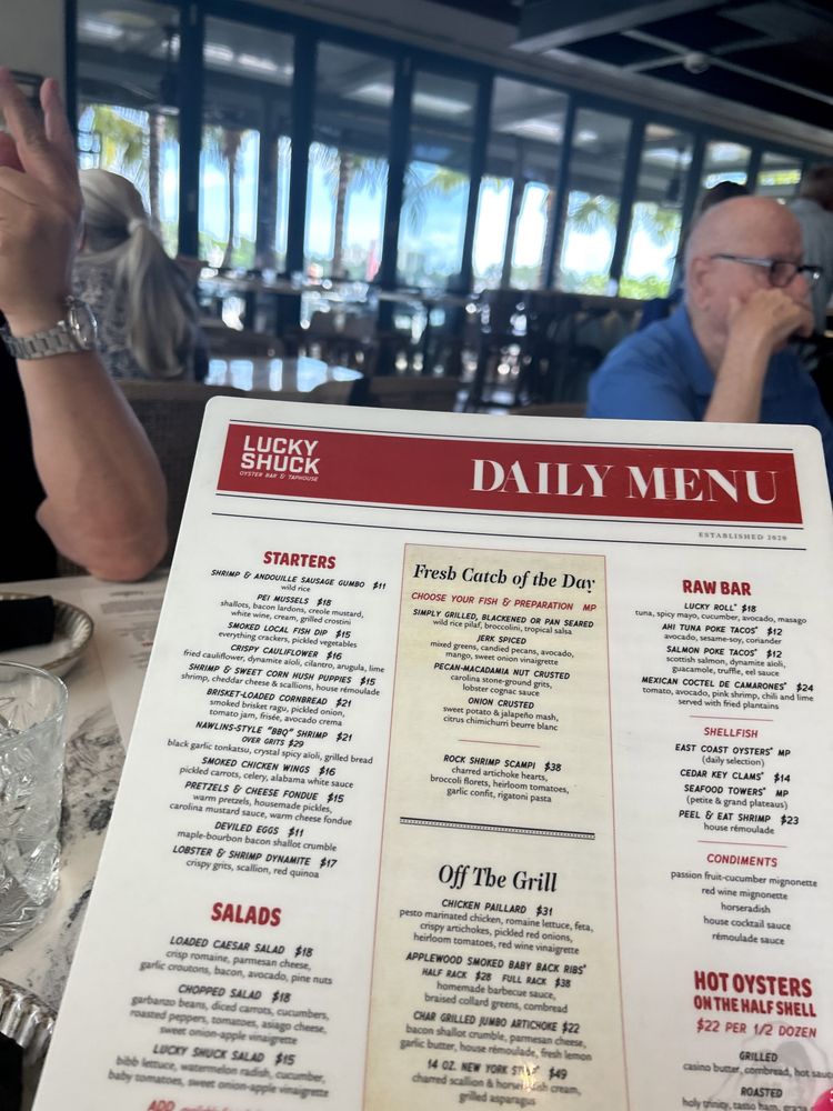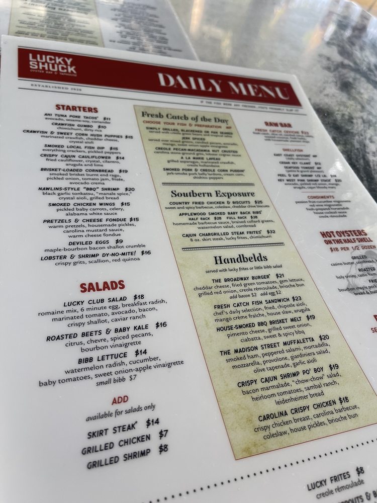 Introducing the menu at Lucky Shuck, a Salad, Bars, and Seafood joint located in Jupiter, FL. This trendy and upscale restaurant offers a wide range of amenities such as outdoor seating, waiter service, full bar, and even an EV charging station. Customers rave about the delicious food, friendly staff, and beautiful views of the Jupiter lighthouse. Highlights include the tuna tacos, cornbread brisket, fish dip, lucky fries, and BBQ shrimp. The atmosphere is described as having good vibes and the service outstanding, with servers like Jenna and Jill receiving high praise. While some minor critiques exist, overall, Lucky Shuck is highly recommended for a fun and enjoyable dining experience with family and friends.